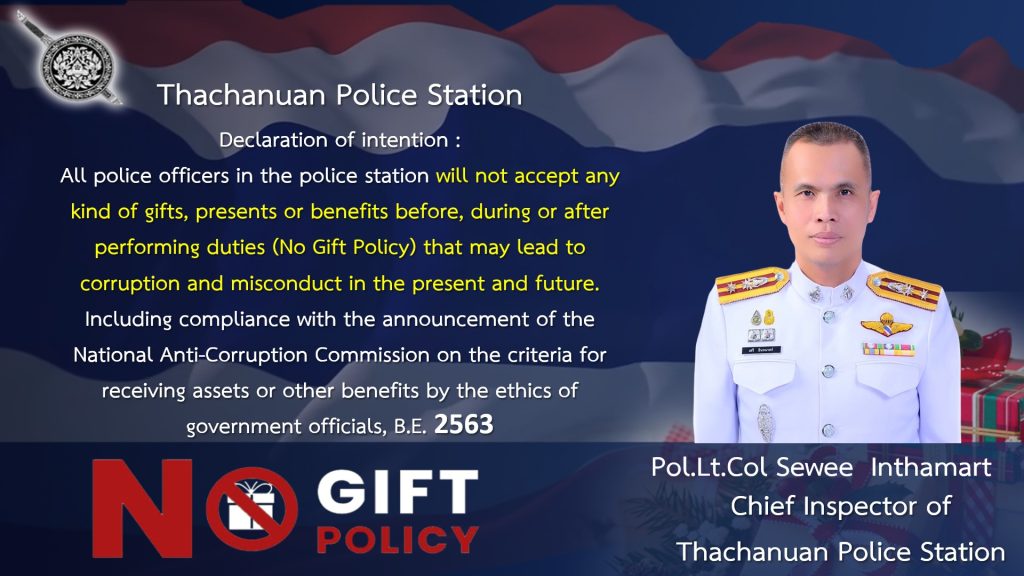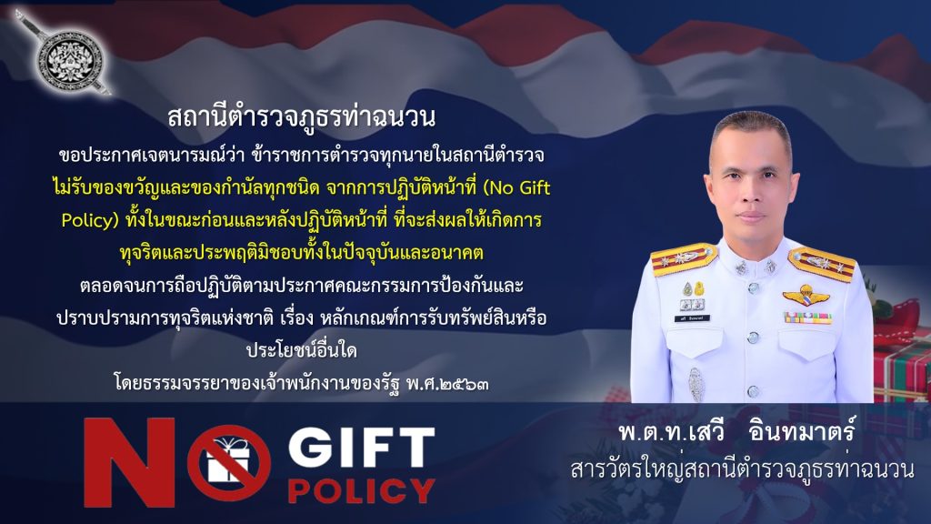 อินโฟกราฟิกนโยบายไม่รับของขวัญและของกำนัลทุกชนิด (No Gift Policy) จากการปฏิบัติหน้าที่ ของสถานีตำรวจภูธรท่านวน