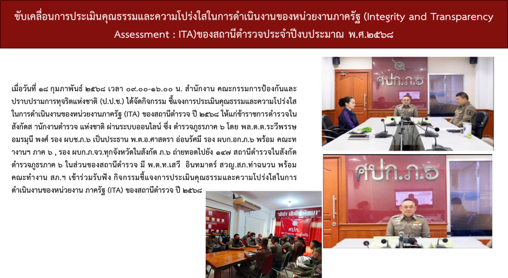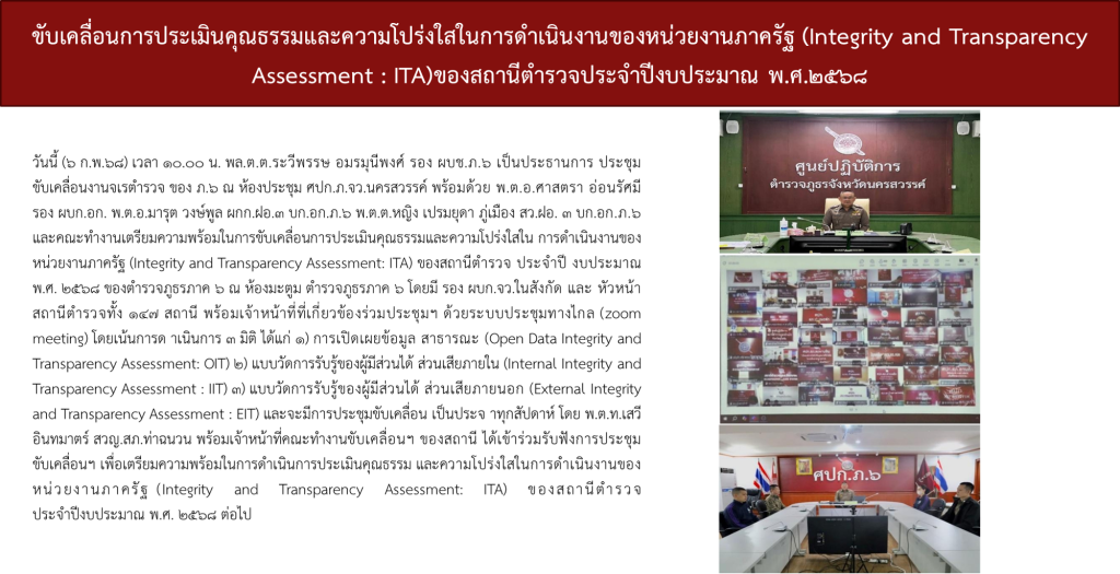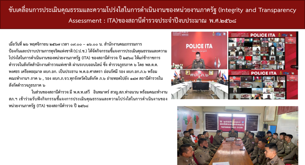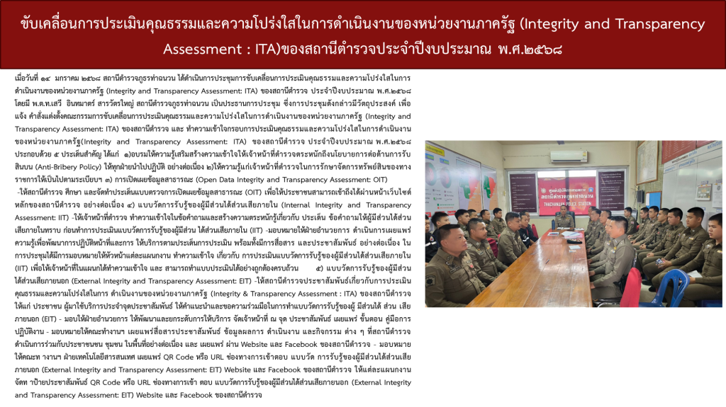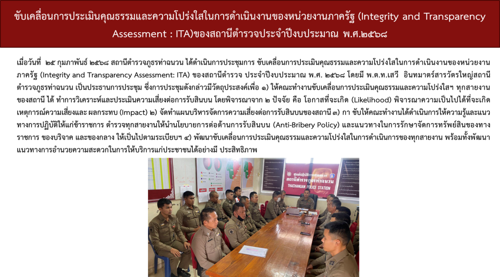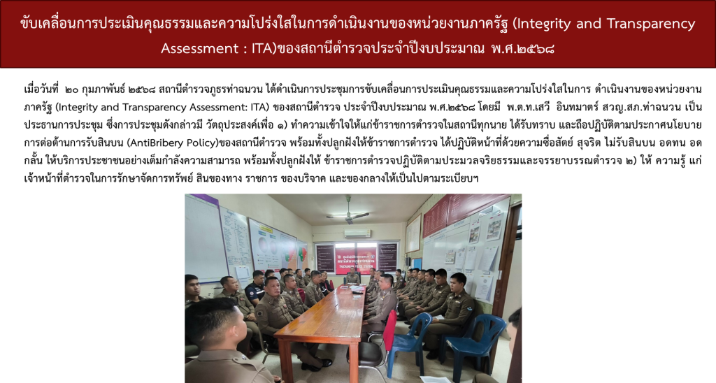 สถานีตำรวจภูธรท่าฉนวนได้ดำเนินการประชุมการขับเคลื่อนการประเมินคุณธรรมและความโปร่งใสในการดำเนินงานของหน่วยงานภาครัฐ (Integrity and Transparency Assessment: ITA)  ของสถานีตำรวจ ประจำปีงบประมาณ พ.ศ. 2568 โดยมี พันตำรวจโท เสวี อินทมาตร์ สารวัตรใหญ่สถานีตำรวจภูธรท่าฉนวน เป็นประธานการประชุม ซึ่งการประชุมดังกล่าวมีวัตถุประสงค์เพื่อแจ้งคำสั่งแต่งตั้งคณะกรรมการขับเคลื่อนการประเมินคุณธรรมและความโปร่งใสในการดำเนินงานของหน่วยงานภาครัฐ (Integrity and Transparency Assessment: ITA) ของสถานีตำรวจ และทำความเข้าใจ  กรอบการประเมินคุณธรรมและความโปร่งใสในการดำเนินงานของหน่วยงานภาครัฐ (Integrity and Transparency Assessment: ITA) ของสถานีตำรวจ ประจำปีงบประมาณ พ.ศ. 2568 ประกอบด้วย 3 ประเด็นสำคัญ ได้แก่