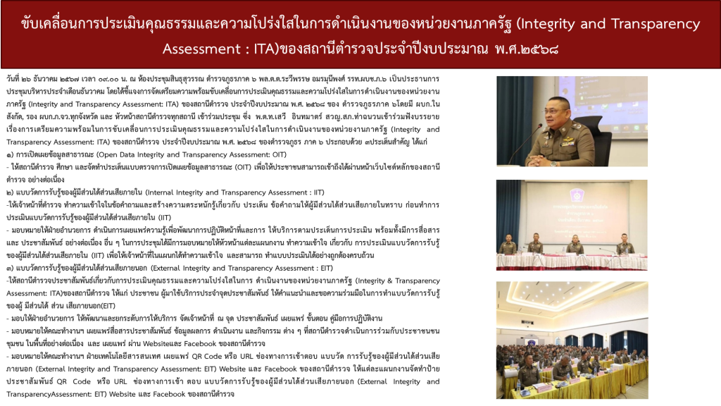 1. การเปิดเผยข้อมูลสาธารณะ (Open Data Integrity and Transparency Assessment: OIT)   – ให้สถานีตำรวจศึกษาการเข้าใช้ระบบ POLICEITA พร้อมจัดทำข้อมูลสาธารณะตามแบบฟอร์ม ที่กำหนดลงในระบบดังกล่าว